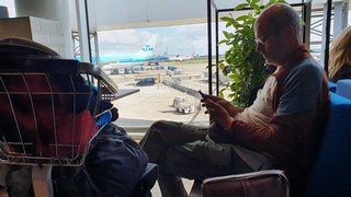 Zaterdag, we zitten nu rustig op Schiphol. Vanochtend vroeg opgestaan en ontbeten in het hotel. We hebben redelijk geslapen, het bed was wat hard en blijkbaar toch warm op de kamer, ik zweette nogal. Ingrid had het daarentegen koud?