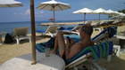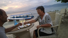 Vrijdag, 22 mei. Aan het strand rondhangen Ik had de wekker gezet op half negen, bang dat we een gat in de dag zouden slapen. En het bleek een goede gedachtegang want we werden gewekt door de telefoon. Nee, niet iemand die belde, het is ook mijn wekker. Half duf zijn we naar beneden gegaan. Naar beneden want onze kamer ligt op de 1ste verdieping. De kamers zijn namelijk aan een straatje op 2 verdiepingen de kamers: begane grond en 1ste verdieping. Het restaurant kijkt uit over de zee en slechts een smal paadje scheidt het af van het strand. Ligbedden en parasols staan hier opgesteld en met de handdoek van het hotel kan je er gratis gebruik van maken. Ik wilde echter na het ontbijt eerst regelen dat we wat langer hier konden blijven.
