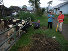 Na ongeveer 3,5 uur waren we al in Bandung. Lekker snel dachten we nog maar we hadden voor vandaag een excursie geboekt, wandelen bij de Friese Vlag koeien. En dat blijkt een uurtje rijden te zijn, door het drukke verkeer van Bandung heen naar het noorden. Daar werden we opgewacht door de lokale gids, een jonge jongen, net van school af. We besloten toch eerst te gaan eten, ook dat zat bij de excursie in, in plaats van eerst te lopen. Voor ons Europeanen was het lunchtijd. Wij zijn de gasten dus allemaal geen probleem. Het lunchen is bij de mensen thuis, Sudanees eten werd het, witte rijst, soep, groente, kip, etc. Alles lekker lekker. Na het eten gingen we op weg, met paraplu, de donder was al te horen. We zijn langs de koeien gekomen, inderdaad zwartbont vee, langs akkers met bloemkool, uien, knoflook, sperciebonen etc. En tot zover de Nederlandse groenten want er groeit nog veel meer. Alles wat langs de weg staat wordt ook gebruikt bij het eten maar ik heb niets daarvan kunnen onthouden. Iets wat ruikt naar kaneel, ui, citroen, oregano, allemaal met namen die niet zijn blijven hangen, helaas. De gemeenschap is door dit alles redelijk welvarend en zelf supporting. Ook de koeiemst wordt gebruikt, niet voor bemesting van de akkers maar om methaangas uit te winnen. Dit gaat zo goed dat geen gas hoeft te worden aangevoerd van buiten.