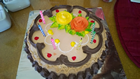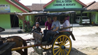 Eindelijk de uitgang en terug naar het hotel voor het ontbijt. Dat werd niet eerder klaar gemaakt dus nu een laat ontbijt om ondertussen 08:00. En wie komt daaraan lopen met iets in zijn handen? Kur! En "voor mevrouw her verjaardag" en zet een prachtige taart voor onze neus. Hij is het dus niet vergeten dat het nu Ingrid is die jarig is. Een vette hap dachten we maar nee, het was heerlijk. We hebben samen met Peter en Ruth de helft opgegeten en de rest aan een gezin gegeven. Na het ontbijt zijn we in het dorp met een paard en wagen (Andong) de kampong gaan bezoeken. Het is een gemeenschap waar ieder zo zijn taak heeft: werken op het veld, in de fabriek voor kroepoek etc. En dat wisselt door de tijd, ploegendienst. Het is verbazend om te zien wat ze met casava-wortel allemaal kunnen maken. Niets gaat verloren. Als afsluiting van de rondgang door het dorp kregen we thee met hapjes: lekker.