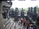 Naar de Prambanan en Batik fabriek Onderweg naar de tempel stopten we eerst bij een Batik atelier. Ze maakten hier geen kleding maar kunstwerken en inderdaad schitterende stukken hingen aan de muur. Echter Ingrid voelde zich al niet goed toen ze opstond en het werd er niet beter op. Ze had al wel een paracetamol ingenomen maar die werkte nog niet echt. We waren nu ook snel buiten. Eerst maar naar de apotheek, voor immodium, de voorraad begon al aardig te slinken, en daarna besluiten we wel of we door gingen of terug naar het hotel. Maar paracetamol werkt goed dus toch maar het programma afwerken. Nu eerst naar een zilveratelier. Van blokken zilver trekken ze zilverdraad en deze worden verwerkt in ware kunststukjes. Ik had Ingrid nog geen verjaardagskado gegeven maar dit was een mooie gelegenheid voor een paar oorbellen. Ze wilde ook nog wel een t-shirt of blouse van Batik en dat is er tegenover. Ook hier weer werden we eerst door het proces van fabricage geleid voordat je bij het eindresultaat in de winkel komt: kleding. En zowaar, ze heeft een prachtige blouse gevonden. Ikzelf heb een Javaanse doek gekocht, een soort bandana. Het knopen hiervan kst nog wel wat oefening. En dan toch naar de Prabanam. We hebben beleefd de gids afgeslagen. We wilden rustig zelf onze weg vinden. Maar wat een mooie tempel. Bij een aardbeving is er veel naar beneden gekomen, maar de hoofdgebouwen zijn weer hersteld, hoewel je wel kan zien dat niet alles meer origineel is. Teveel beschadigd. Met de kleinere tempeltjes erom heen zijn ze nog druk bezig om deze weer te herstellen. Sommige zijn niet meer dan een hoop stenen, van andere zijn ze bezig de fundering weer neer te leggen. Alles met de hand. Missende delen worden uit nieuwe blokken steen uitgehouwen. Wat een monnikenwerk. 's Avonds zijn we naar een balletvoorstelling geweest met diner buffet. Ikzelf heb rustig aan gedaan wat eten betreft. Ik vertrouwde mijn ingewanden nog niet helemaal. Maar wat ik op had was wel erg lekker. De voorstelling was natuurlijk een legende wat in een dans tot uitdrukking werd gebracht. Allemaal mooi vormgegeven en vol met symboliek. Ik werd alleen misselijk, moest bijna overgeven. Ik ben dan ook achterin de zaal gegaan. Ik vond het niet eerlijk tegenover de persoon voor me als ik inderdaad moest overgeven en dat in zijn nek moest neerleggen. Achterin kon ik liggen op een bank en de druk viel weg. Ik kon de voorstelling daarom nog wel uit zien. Mooi om te zien maar een keer is genoeg denk ik zo :-) |