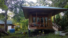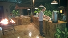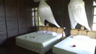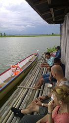 Ook nu ca. 30 minuten varen en kwamen we bij ons resort aan. We konden nog net met droge voeten aan wal komen, het water was al weer wat gestegen. Na het bekende welkomst drankje en de briefing over de huisregels door Emmy werden we naar ons hutje gebracht. Het doet sterk aan Fiji denken, het paadje met veel planten en bomen en het uitzicht. Het is duidelijk een minder resort dan Thalassa. Het uitzicht en accomodatie in de grote ruimte waar we eten is fenominaal, zo direct aan het water, maar de hut is duidelijk minder. Geen airco maar alleen een fan is tot daar aan toe, maar de toiletruimte is groot maar minimaal ingericht: een toilet waar de watercloset het niet doet, een douche met alleen koud water en een wastafel in de anderen hoek waar het water over de vloer wegstroomt naar het putje bij de douche. Ook is het nu niet bepaald brandschoon. Het minste wat we tot nu toe hebben gehad. Ben benieuwd of we kunnen slapen straks met alleen een fan. Het eten is prima en Terry de eigenaar had een fles wijn waar we ook nog een slok mee mochten drinken. Diana zijn vrouw viel aan tafel in slaap, en dat na slechts 2 slokken wijn. Maar ook Ingrid had moeite om haar ogen open te houden op een bepaald moment :-)
