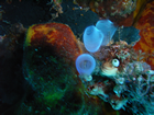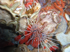 24 april, dag 2 in Dongala, weer duiken vandaag. Ingrid voelde zich goed vanmorgen en we gingen dan ook goed gemutst naar het ontbijt. Alleen de hoeveelheid op het bord van Ingrid was toch iets te hoog gegrepen. Ze kon het niet op krijgen, blijkbaar nog niet geheel hersteld. Maar ze ging wel duiken, zo goed voelde ze zich wel. Half tien stond op het programma maar Ingrid was om kwart over negen bij de duikshop, zij moest nog een passend pak zien te vinden. Dat is niet helemaal gelukt, het was of te ruim of t krap. Het werd dus te ruim, kan ze in ieder geval ademen :-) We gaan bij het huisrif het water in, maar de stroming was nog te sterk volgens Igede. Het werd dus 10 uur dat we het water in gingen en inderdaad, de stroming was nagenoeg weg. Rustig zijn we afgezakt naar uiteindelijk 22 meter max. Onderwg weer veel vis gezien, naaktslakken en ... een dwerg zeepaardje. Voor de goede foto moet je op de openingspagina kijken, want op mijn foto zie je het niet duidelijk, hij keek de andere kant uit en dan zie je eigenlijk alleen zijn rug. Maar de camouflage is zo goed dat je het op een stilstaand beeld niet kan herkennen als je niet gewezen wordt waar te kijken. Ingrid zag het eerst ook niet en hield vertwijfeld haar handen omhoog. Er kwam een loep te voorschijn bij Igede en toen zag Ingrid iets bewegen aan het koraal en herkende ze een zeepaardje. Toen ik dichterbij kwam had ik ook moeite om het te zien, maar dankzij mijn aangepaste duikbril zag ik het wel direct. Maar het dan nog scherp op de foto te krijgen valt niet mee, maar is gelukt.