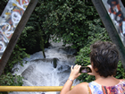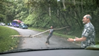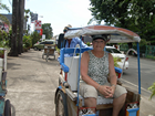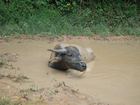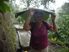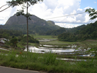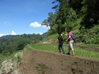 Hierna zijn we de bergen in gereden en hebben boven in Batutulmonga geluncht. Dit is een restaurant op 1380 meter, handig zo'n GPS. Niet te geloven hoe mooi dat was neergezet. Het drijft volgens mij volledig op de toeristen en de Daniel bevestigde dat ook met een lach. Het begon te regenen maar dat was van korte duur. Toch bleef de lucht dreigend. Daniel kwam ons dan ook halen. We zouden door de rijstvelden een stuk naar beneden lopen en het was nu nog droog. Wij de paraplu mee uit de auto van Sam en op pad. Het was flink glibberig bij tijd en wijle en Ingrid werd dan ook netjes aan de hand genomen om over de lastige trajecten heelhuids naar beneden te komen. Ook de bamboe bruggen, nu ja, een paar stammetjes lagen dan naast elkaar en zie maar dat je over het water komt, werden met enige aarzeling genomen.En zonder noemenswaardigheden hebben we de weg afgelegd. Er waren stukken bij met een grandioos uitzicht over de velden het dal in. Echt wel mooi om te zien. En hiernaa weer terug naar het hotel. Sam wist een kortere weg blijkbaar want hij sloeg opeens af een zandpad op. Als dat maar goed gaat dachten we nog en .... NEE het ging niet goed. Op een laag gedeelte was het er erg modderig en glad bleek. We kwamen vast te zitten. Alle trucs werden uitgehaald maar we groeven ons steeds verder in. Uiteindelijk zijn we met behulp van de lokele bevolking eruit gekomen. Een schep om de rnd van de kuil wat te effenen, veel kleine stenen voor de wielen en dan met z'n allen duwen en hopen dat er niet al te veel modder opspuit of de wagen opeens wegschiet waarbij je dan languit in de modder ligt. Maar het ging goed en we zijn eruit gekomen. De weg blijkt dus wel korter te zijn maar niet sneller :-)
