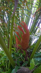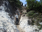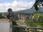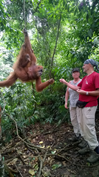 Met Bendi de jungle in. We hadden een trektocht van 3 uur voor de boeg. De tijd is van rubber dus het kan ook wel wat langer worden. We hadden geen haast zei Bendi. Hij had zijn 'vriend' meegenomen, maar volgens mij was het een lokale gids die beter in het opsporen van de apen is dan hijzelf. De rugtas die Bendi had toen hij ons bij het restaurant oppikte hing al over de schouders van zijn 'vriend'. Het werd een lange trap op naar boven voordat we in de jungle kwamen. Af en toe was de trap glad en werd Ingrid prompt bij haar hand genomen. Met een schuin oog naar mij of ik het wel redde, dat dan weer wel. Met een lange broek, de pijpen in de kousen gestopt tegen de bloedzuigers en mieren, was het behoorlijk zweten. Gelukkig scheen de zon niet op zijn felst maar het bleef warm, broeierig warm.