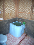 Maar we waren beneden begonnen en moesten aan het eind toch nog een stuk omhoog klimmen. Dit door een bamboebos. Maar wat een rust. Alleen de wind, vogels en andere geluiden maar gen motoren. Een onaangename verrassing stond aan het eind van de klautering te wachten: rijstvelden. Maar ook dit ging goed zodat we min of meer droog bij de weg kwamen. Bij een moskee hebben we onze voeten en sandalen kunnen reinigen zodat we schoon de auto in konden die daar stond te wachten. Nee nog niet terug naar het hotel, we waren namelijk in het Kota Kadang, het dorp wat bekend staat om het zilverwerk. Op zich hadden we daar niet zoveel trek in, we hadden dat al eerder gezien, maar we zijn toch maar mee gegaan in deze. Bij een zilversmid hebben we toch wat gekocht en Ingrid heeft het aangedurfd om haar armband hier achter te laten. Het slotje was uitgesleten en voor 50.000 Rp kon hij het wel maken. 's Avonds om zeven uur zou hij het bij het hotel brengen. En inderdaad, om zeven uur stond hij daar, maar Indrid werd er niet blij mee. Het slotje sloot wel weer, maar het veertje functioneert nauwelijks en ook de reparatie blinkt niet uit door vakmanschap. Na wat te hebben lopen mopperen hebben we 20.000 Rp terug gekregen. Blijkbaar vond hij het ook niet een succes. Dan toch maar in Nederland een volledig nieuw slotje laten zetten. Veel meer hebben we die dag niet gedaan. Oh ja, toch nog wel iets. We zijn over de markt gelopen, veel kleding ditmaal en bij de Big Ben, de Jam Gadang, geweest. Maar dat was het dan wel. We hebben samen met Ilse en Nick gegeten bij Neta en zijn daarna nog een stukje gaan wandelen. Bij de Jam Gadang was het een gezellige boel. Veel kleurrijke lichtjes in de bomen, verkopers die wat speelgoed verkochten met lichtjes, en veel jeugd. Het was leuk om te zien. Een toch wel mooie afsluiting van een vermoeiende dag. 10 mei, de fietstocht Gisteren stond Rudy ons al op te wachten. Hij is onze gids voor de fietsexcursie die we hadden geboekt. Bijtijds moesten we vertrekken zodat we zeker waren dat we geen regen zouden krijgen dus om 7:45, een kwartier later dan we hadden afgesproken stonden we klaar. Een kwartiertje met de auto wat ons buiten de drukte bracht en daar stonden de fietsen klaar. En daar gaan we dan. De fietsen op de juiste hoogte afgesteld en dat is echt wat hoger dan hoe ze stonden, en dan rustig rijdend door het omliggende landschap. Rudy deed het rustig aan, zo rustig dat we af en toe bijna stil stonden, maar zo konden we op ons gemak om ons heen kijken. Door dorpjes, langs oude Minangkabau huizen met hun karakteristieke daken, langs oude moskeeen die een mix van stijlen hebben. Het was een interessante fietstocht. Al met al waren we 4 uur onderweg. Nog wel koffie gedronken in een lokaal cafe. Dit was een hutje, met een lange tafel in het midden. We werden bediend door een meisje van 11, want vader werkte op het veld en moeder was naar de markt. Dit ook omdat het zondag was, want anders was ze naar school. Het was bijzonder om daar zo te zitten. Ook het toilet vond Ingrid bijzonder: twee plankjes boven de beek en een schuine plank als een soort van deur :-)