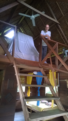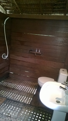 Na de lunch werden we naar ons huisje geleid en wat is dat leuk. Een veranda, binnen slapen we op een vide onder de klamboe, de douche heeft een vloer van een open houten raamwerk zodat het water meteen op het zand onder het huisje valt. Een goed gevulde koelkast complementeert het geheel en ditmaal is het niet duurder dan in het restaurant. Ook wel eens anders meegemaakt kan ik je verzekeren. en de middag hebben we heerlijk doorgebracht in het werkelijk warme water van de Indische oceaan, de temperatuur is zo'n 32 graden! Toch koelt het wel af gelukkig want boven het water is het nog veel warmer want de zon toonde zich ook weer.
